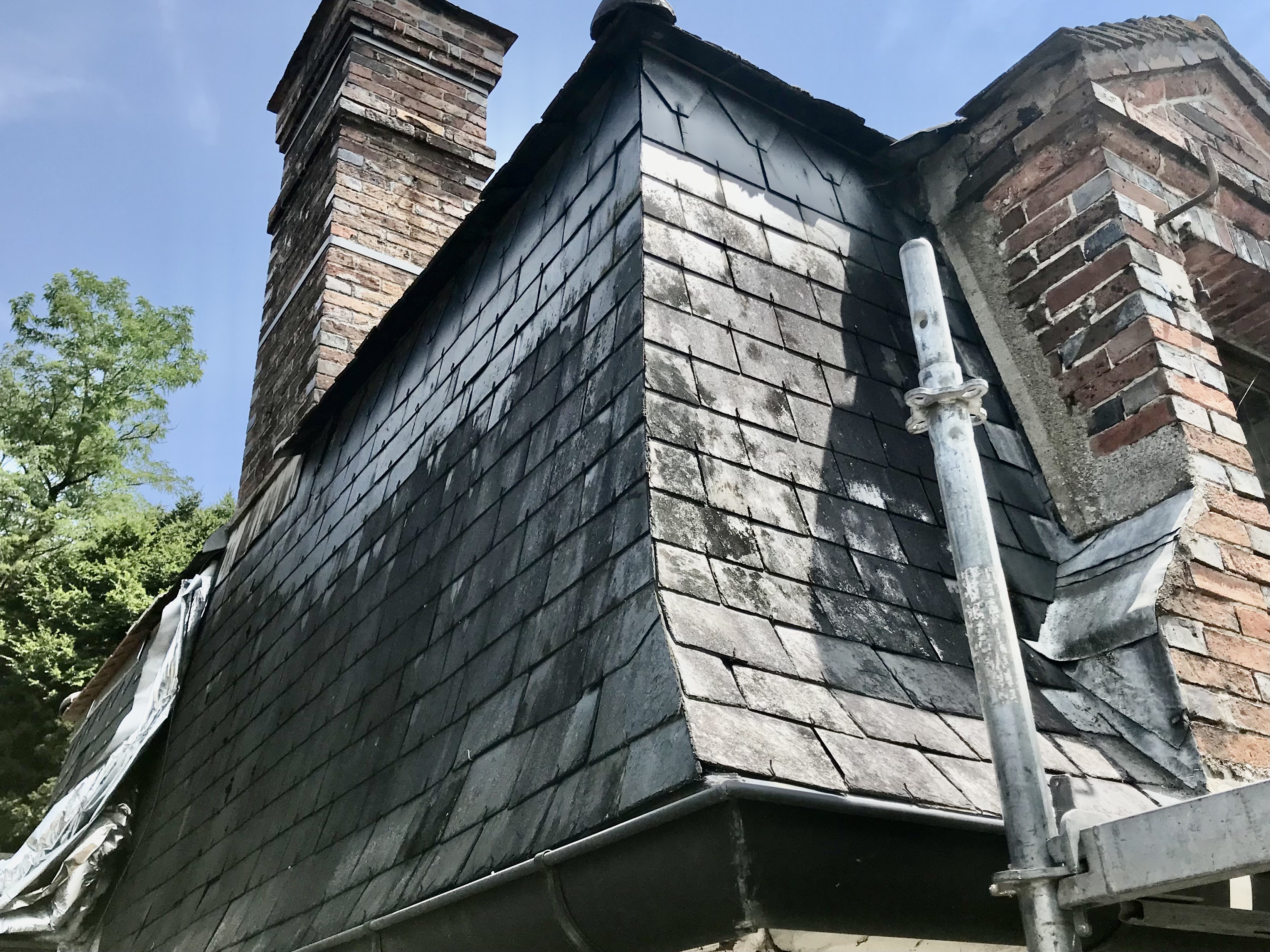 - lundi 13 : Moi et Loïc (Reprise des malfaçons de l'échafaudeur "professionnel" (!), dont installation du filet de protection coté rue (!) ... Et commencement du démontage de la vieille toiture, du lattage et de la zinguerie ...) (A noter que des collègues - Thomas et Lee - étaient déjà venus une journée un peu plus tôt pour commencer à enlever la vieille ardoise (!))